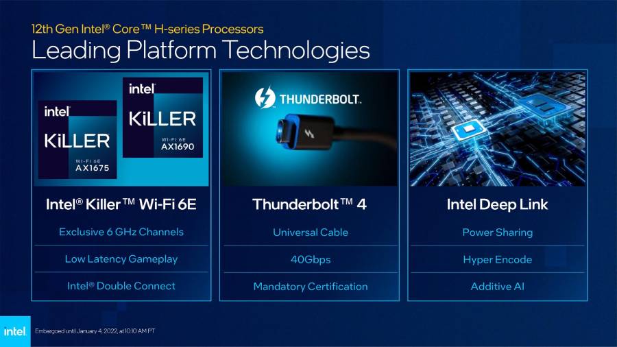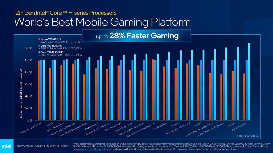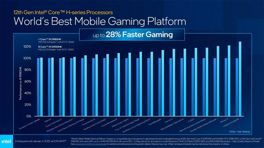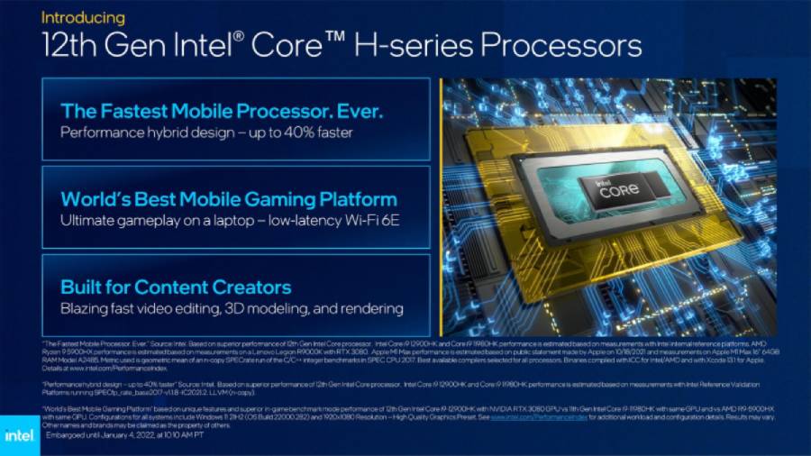 ไฮไลท์ของซีพียูรุ่นใหม่นี้ก็คือ ซีพียูรุ่นท็อปสุด i9-12900HK ที่มี 6 P-core + 8 E-core รวม 14 คอร์ 20 เธร็ด, สามารถทำงานที่ความถี่สูงสุด 5GHz ทางบริษัทเผยว่ามีประสิทธิภาพโดยรวมดีขึ้นถึง 40% เมื่อเทียบกับรุ่นก่อน พร้อมประสิทธิภาพด้านการเล่นเกมที่ดีขึ้นอีก 28% และประสิทธิภาพด้านการเรนเดอร์ 3D เพิ่มขึ้น 43% ทำให้มันกลายเป็นซีพียูโน้ตบุ๊กที่แรงที่สุดในโลกในขณะนี้ด้วย