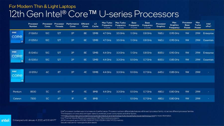 ซีพียูทุกรุ่นที่เปิดตัวในรอบนี้จะมีจีพียู Intel UHD เวอร์ชันใหม่ที่ใช้สถาปัตยกรรม Xe ที่มีจำนวนคอร์ตั้งแต่ 48-96 คอร์ (EU) โดยบริษัทได้เปิดตัวซีพียู Alder Lake สำหรับโน้ตบุ๊กทั้งหมด 28 ตัว แบ่งเป็น 3 ซีรีส์ย่อยคือ: