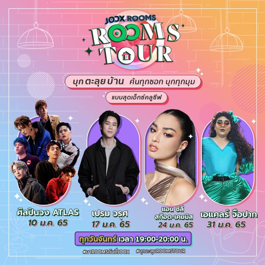 เริ่มต้นสัปดาห์ด้วยรายการ “ROOMS Tour” ที่ JOOX จะมาพาทุกคนไปบุกตะลุยบ้าน หรือสถานที่สุดเอ็กซ์คลูซีฟของเหล่าคนดังแห่งปี ไม่ว่าจะเป็น บุกห้องซ้อมเต้นของไอดอลจากวง ATLAS, เปิดสตูดิโอใหม่ของหนุ่ม เปรม วรุศ, แอนชิลี สก๊อต เคมมิส และตะลุยห้องเม้าท์ของบิวตี้บล็อกเกอร์ชื่อดัง เอแคลร์ จือปาก แล้วมาร่วมเปิดประตูห้อง ค้นทุกซอก ทุกมุม ไปพร้อมกันทุกวันจันทร์ เวลา 19.00 – 20.00 น.