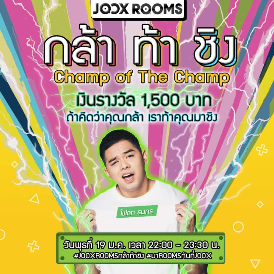 ถ้าคิดว่าคุณกล้า JOOX ขอท้าคุณมาชิง กับรายการ “กล้า ท้า ชิง” โดยมีดีเจหนุ่มอารมณ์ดี โฟลท ธนกร แห่ง EFM มาเป็นโฮสต์สร้างความสนุก ใครที่ชอบลุ้น ชอบเสี่ยง มาร่วมสนุกเพื่อชิงเงินรางวัลกว่า 1,500 บาท ไปแบบง่ายๆ หากคิดว่าแน่ มาร่วมชิงไปด้วยกัน ทุกวันพุธ เวลา 22.00-23.30 น.