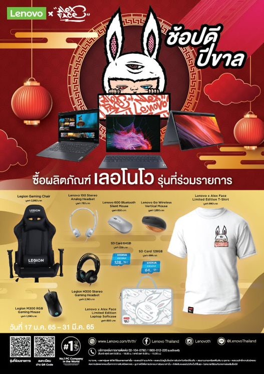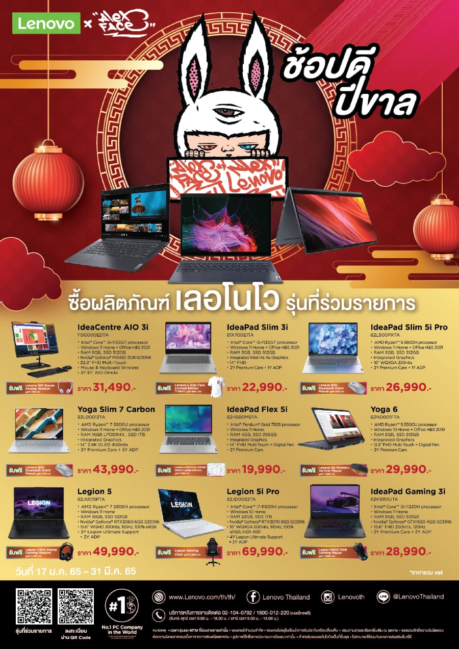 เลอโนโว บริษัทผู้นำด้านคอมพิวเตอร์และสมาร์ทดีไวซ์ระดับโลก จับมือกับ Alex Face จัดแคมเปญโปรโมชั่นผลิตภัณฑ์คอมพิวเตอร์แล็ปท็อป และเดสก์ท็อปราคาพิเศษ ต้อนรับปีขาล 2565 กันแบบจุก ๆ ทั้งโปรโมชั่นราคาพิเศษ และของแถมสุดคิ้วจาก Lenovo และ Alex Face รับฟรีกันทุกออเดอร์กันแบบจัดเต็มไม่จกตา สำหรับรุ่นที่ร่วมรายการ ได้แก่ IdeaCentre AIO, IdeaPad, Yoga, IdeaPad gaming และ Legion เรียกได้ว่าขนแทบทุกรุ่นตัวท็อปจากเลอโนโวมาจัดโปรโมชั่นกันเลยทีเดียว นอกจากนี้ยังมีของสมนาคุณอีกมากมาย เช่น เมาส์ไร้สาย, หูฟัง, กระเป๋าแล็ปท็อปAlex Faceรุ่น limited Edition, เสื้อเชิ้ตAlex Faceรุ่น limited Edition และเก้าอี้เกมมิ่ง โดยโปรโมชั่นเริ่มตั้งแต่วันนี้ – 31 มีนาคม พ.ศ. 2565 เท่านั้น และพิเศษ! โปรโมชั่น cash back 24 มกราคม – 6 กุมภาพันธ์ มูลค่าสูงสุด 4,000 สำหรับรุ่นที่ร่วมรายการ