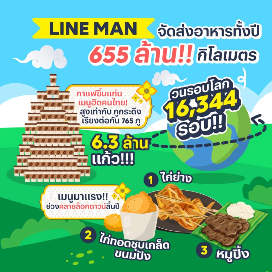 - ไรเดอร์ของ LINE MAN จัดส่งอาหารทั้งปีเป็นระยะทางรวมกัน 655 ล้านกิโลเมตร สามารถวนรอบโลกได้ถึง 16,344 รอบ