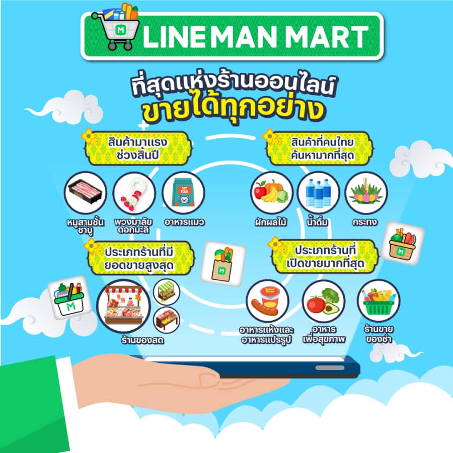 - “ร้านของสด (ตลาดสดและร้านแผงรวมของสด)” เป็นประเภทร้านที่มียอดขายสูงสุดบน LINE MAN MART ตอบรับเทรนด์ทำอาหารกินเองที่บ้าน สั่งของสดหลากหลายถึงมือได้ทันที