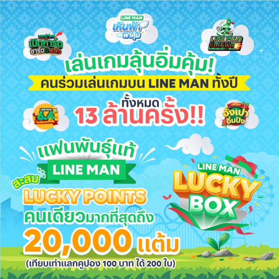 - แฟนพันธุ์แท้ LINE MAN สะสมแต้ม LUCKY POINT ในแคมเปญ LINE MAN LUCKY BOX คนเดียวมากที่สุดถึง 20,000 แต้ม เทียบเท่าแลกคูปองส่วนลด 100 บาท ได้ 200 ใบ (มูลค่าส่วนลดค่าอาหารถึง 20,000 บาท)