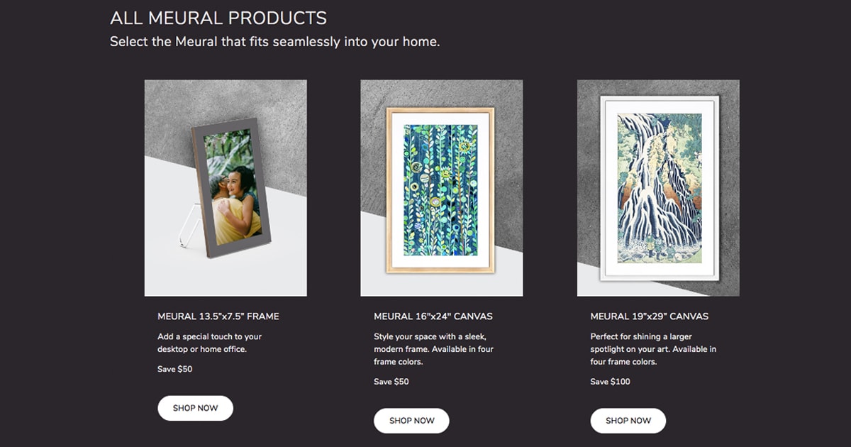 กรอบรูป Meural มีให้เลือกหลายขนาด ตั้งแต่ขนาดตั้งโต๊ะที่ 13.5 x 7.5 นิ้ว ไปจนถึงตัวเลือกที่ติดผนังขนาดใหญ่ที่มีขนาด 16 x 24 นิ้วและ 19 x 29 นิ้ว อย่างไรก็ตาม ไม่มีเฟรมไหนที่ให้ความละเอียดในการแสดงผลได้เกิน 1080p ซึ่งจะว่าไปก็น่าผิดหวังเล็กน้อยที่ให้ความละเอียดได้แค่นั้น