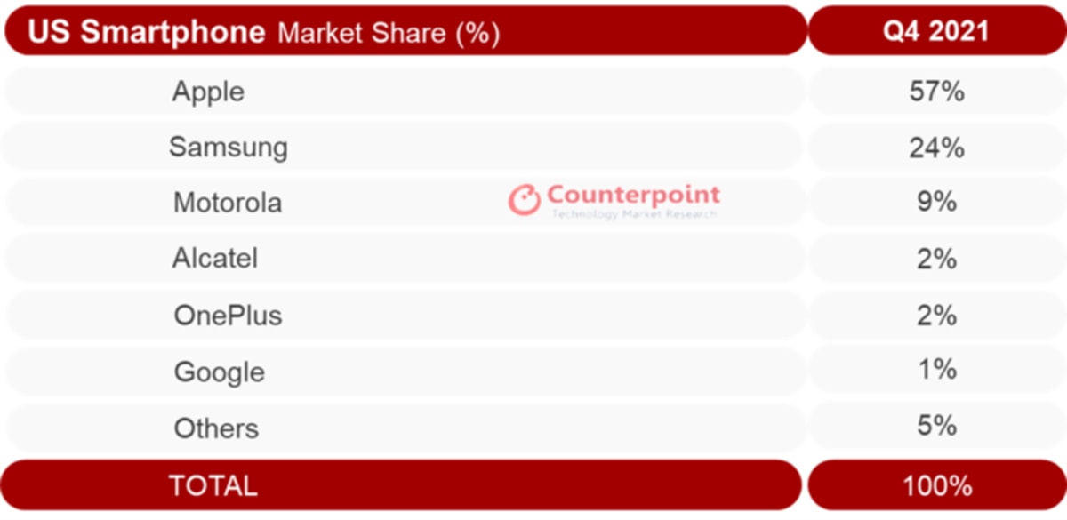 ตลาดสมาร์ทโฟนสหรัฐฯมี Apple ที่สามารถครองเจ้าตลาดได้อย่างเหนียวแน่น โดยสมาร์ทโฟนมากกว่าครึ่งที่จำหน่ายในประเทศปีที่แล้วเป็น iPhone ปิดยอดปี 2021 ด้วยส่วนแบ่งตลาดถึง 57% ด้วยแรงหนุนจากทั้ง iPhone 12 และ iPhone 13 พร้อมกับอัตราการเติบโต 17% เมื่อเทียบกับปีที่ผ่านมา