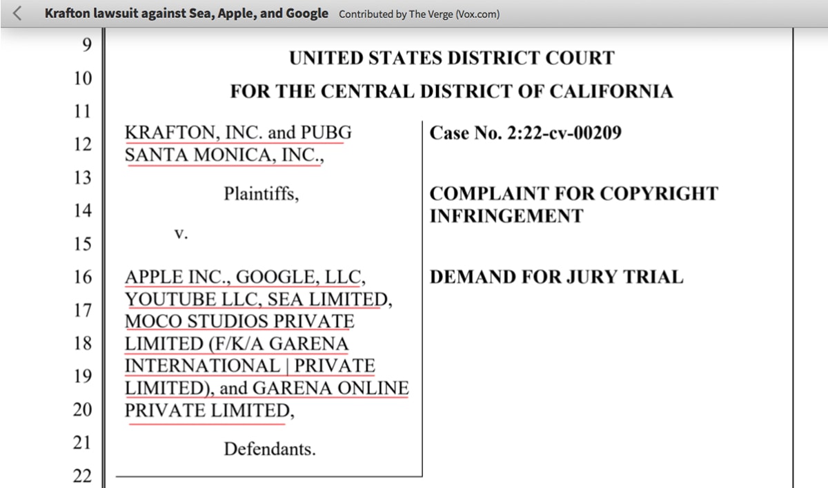 Krafton บริษัทผู้พัฒนาเกมยอดนิยมอย่าง PUBG (PlayerUnknown’s Battlegrounds) ยื่นฟ้องร้องต่อผู้ที่มีส่วนเกี่ยวข้องกับเกม Free Fire และ Free Fire Max เนื่องจาก 2 เกมดังกล่าวมีการลอกเลียนแบบเกม PUBG อย่างชัดเจน โดยบริษัทที่จะโดนฟ้องร้อง ได้แก่ SEA (บริษัทแม่ของ Garana) , Garana และ Moco Studios รวมถึง Apple และ Google ที่เป็นผู้จัดจำหน่ายเกมบนสโตร์ของตัวเองด้วย