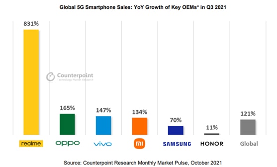 อ้างอิงจากข้อมูลล่าสุดที่ปล่อยออกมาโดยนักวิเคราะห์การตลาด Counterpoint Research realme ได้กลายเป็นบริษัทในกลุ่มสมาร์ตโฟนแอนดรอย์ 5G ที่เติบโตอย่างเร็วและมั่นคงที่สุดในไตรมาสที่ 3 ของประเทศอินเดีย จีน และยุโรป realme มีการเติบโตอย่างรวดเร็วในตลาดสมาร์ตโฟน 5G ด้วยยอดขาย 831% ในปีที่แล้วเมื่อเทียบกับอัตราการเติบโตของแบรนด์มือถือทั่วโลกที่ 121% ในปีที่ผ่านมา