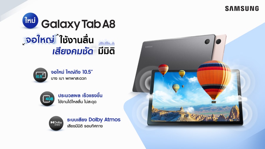 ซัมซุง อิเลคโทรนิคส์ ประกาศเปิดตัว Galaxy Tab A8 แท็บเล็ต ขนาดกระทัดรัดและทรงพลังที่สุดในตระกูล Galaxy Tab A Series อัดแน่นด้วยสเปคที่ครบครัน ทั้งหน้าจอขนาดใหญ่ แบตเตอรี่อึดจุใจ และประสิทธิภาพเต็มเปี่ยมในดีไซน์บางเบา พร้อมยกระดับทุกการใช้งานตั้งแต่การเรียน ความบันเทิง การเชื่อมต่อ และอื่นๆ อีกมากมาย มอบประสบการณ์ที่เต็มอิ่มจุใจในแบบฉบับที่พกพาง่ายเข้ากับทุกไลฟ์สไตล์ ในราคาที่คุ้มค่า และยังสามารถเชื่อมต่อกับผลิตภัณฑ์ซัมซุงกาแลคซี่อื่นๆ ได้อย่างลื่นไหลไร้รอยต่อ