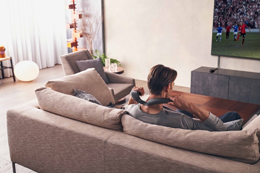 สำหรับ SRS-NS7 ได้รับการออกแบบมาให้มีความยืดหยุ่นตามหลักสรีรศาสตร์ให้พอดีกับคอในขณะสวมใส่ เหมาะสำหรับการรับชมภาพยนตร์หรือรายการทีวีที่ชื่นชอบเป็นเวลาหลายชั่วโมงได้อย่างสะดวกสบาย รวมถึงอายุการใช้งานแบตเตอรี่ที่ให้คุณเพลิดเพลินไปกับการใช้งานอย่างต่อเนื่องถึง 12 ชั่วโมง และ 5 ชั่วโมงสำหรับระดับเสียงสูงสุด
