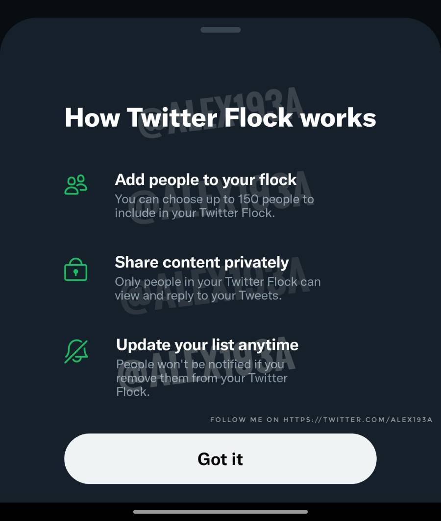 ซึ่งทางนักพัฒนามือถืออย่าง Alessandro Paluzzi ก็คอยติดตามการพัฒนาฟีเจอร์นี้มาตลอดและพบว่า ตอนนี้มันเริ่มเป็นรูปเป็นร่างมากขึ้นแล้ว โดยเขาอธิบายว่า ทวิตเตอร์จะให้คุณเพิ่มกลุ่มเพื่อนลงใน Flock ซึ่งสามารถเพิ่มได้มากสุด 150 คน
