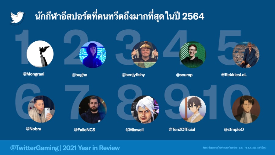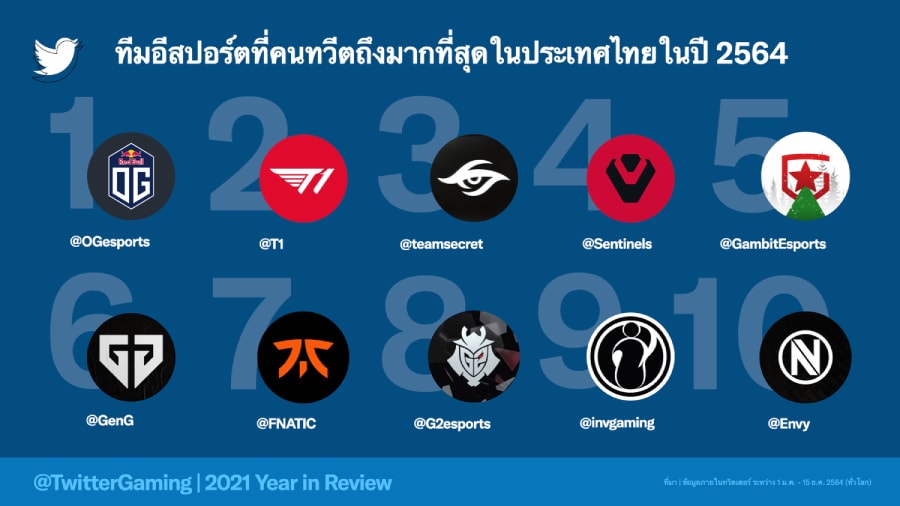 สำหรับประเทศไทย Genshin Impact (@GenshinImpact) เป็นเกมที่ถูกพูดถึงมากที่สุดบนทวิตเตอร์ในปี 2564 และอีก 4 อันดับแรกที่ได้รับความนิยมในประเทศไทย คือ Garena Free Fire (@freefireth),League of Legends (@LeagueOfLegends), PUBG: BATTLEGROUNDS (@PUBG) และ Identity V (@IdentityVJP) ส่วนทีมอีสปอร์ตที่ถูกทวีตถึงมากที่สุดในประเทศไทยในปี 2564 ได้แก่ OG (@OGesports), ตามมาด้วย T1 (@T1), Team Secret (@teamsecret), Sentinels (@Sentinels) และ Gambit (@GambitEsports)