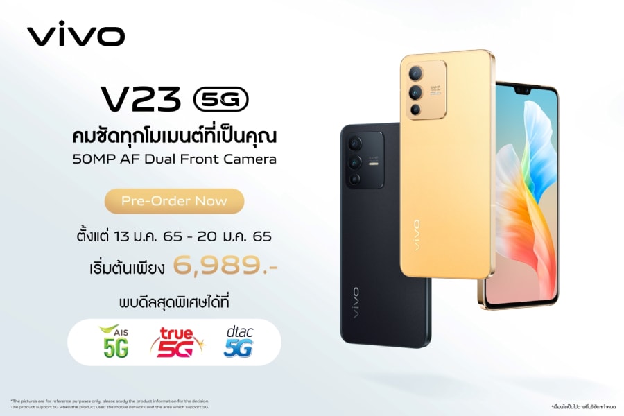 นอกจากนี้ ยังสามารถสั่งจอง เตรียมเป็นเจ้าของ vivo V23 5G พร้อมกับดีลสุดพิเสษ ผ่านทางเครือข่ายผู้ให้บริการทั้ง 3 เจ้า ทั้ง AIS 5G TRUE 5G และ dtac 5G ได้แล้วตั้งแต่วันนี้ – 20 มกราคม 65 ในราคาเริ่มต้นเพียง 6,989 บาท เท่านั้น!