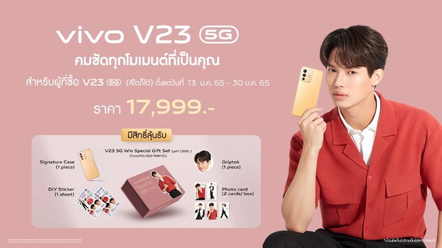 - ลูกค้าที่มีสิทธิ์เข้าร่วมกิจกรรมได้คือลูกค้าที่ซื้อสมาร์ตโฟน vivo V23 5G ตั้งแต่วันที่ 13 – 30 มกราคม 65 และสำหรับลูกค้าที่สั่งจองสมาร์ตโฟน vivo V23 5G ล่วงหน้า (Pre-order) ในช่วงวันที่ 13 – 20 มกราคม 65 และชำระเงินเต็มจำนวน รวมถึงรับเครื่องเรียบร้อยแล้ว จึงจะมีสิทธิลุ้นรับของรางวัล vivo V23 5G Win Special Gift Set