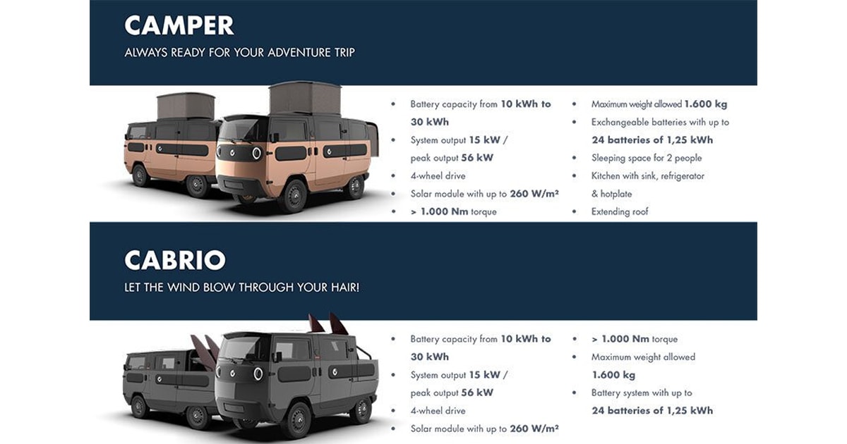 รถรุ่นนี้เหมาะกับการใช้งานสารพัดประโยชน์ ไม่ว่าจะเป็นรถส่วนตัว สำหรับธุรกิจ หรือการเดินทางไปแคมป์ปิ้งช่วงวันหยุดสุดสัปดาห์ มีให้เลือกแชสซี 2 แบบ แบบ cabrio กับแบบ bus โดยสามารถปรับรูปแบบรถได้ตามชอบใจ