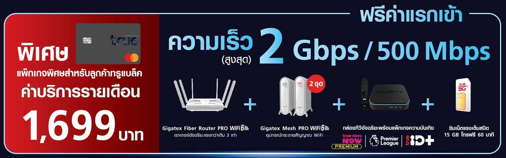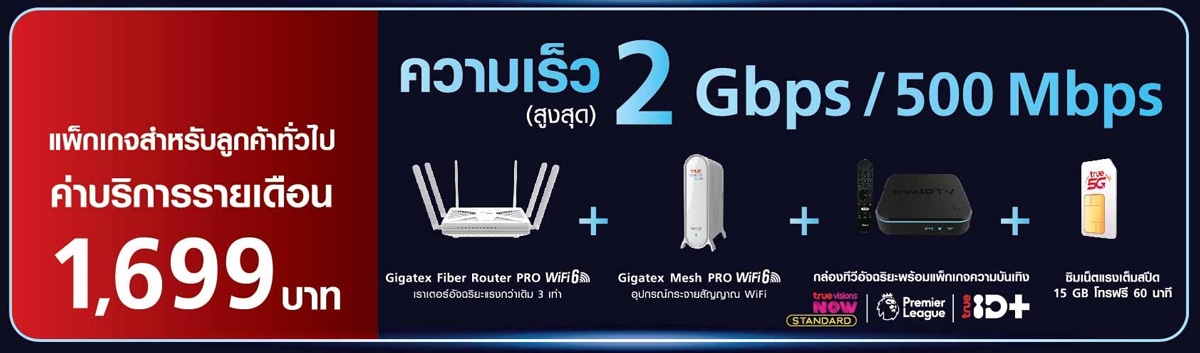 พิเศษสำหรับลูกค้า True Black ค่าบริการรายเดือน 1,699 บาท ได้ความเร็วสูงสุด 2Gbps/500Mbps มีอุปกรณ์และบริการให้ดังนี้