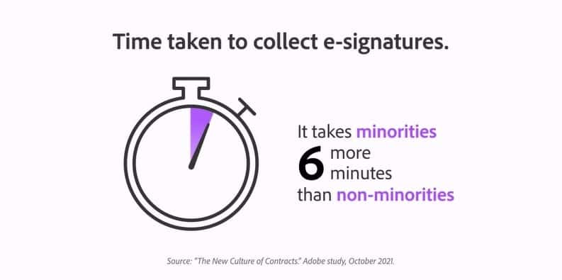 นอกจากนี้ การรับทราบข้อมูลจากเพื่อนร่วมงานก็เป็นปัญหาท้าทายสำหรับพนักงานที่เป็นผู้หญิงและชนกลุ่มน้อย* โดยเฉลี่ยแล้วพนักงานมักจะต้องใช้เวลาราว 83 นาทีในการรวบรวมลายเซ็น โดยจะต้องมีการติดตามให้ผู้เกี่ยวข้องเซ็นต์ชื่อโดยเฉลี่ย 3 ครั้ง และใช้เวลา 8 วันในการสรุปข้อตกลงจนเสร็จสมบูรณ์ พนักงานที่เป็นผู้หญิงระบุว่าโดยเฉลี่ยแล้วพวกเธอใช้เวลามากกว่าผู้ชาย 27 นาทีในการรวบรวมลายเซ็น และในสหรัฐฯ พนักงานที่เป็นชนกลุ่มน้อยที่ด้อยโอกาส* ต้องใช้เวลามากกว่าพนักงานทั่วไปราว 6 นาทีในการรวบรวมลายเซ็น