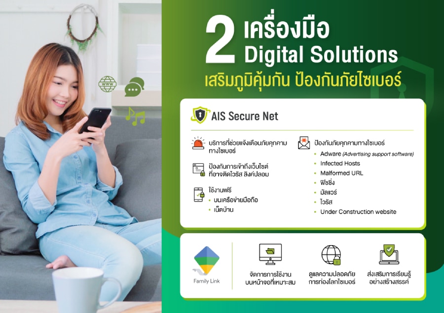 นอกจากนี้ AIS ยังมีเครื่องมือที่เป็นเสมือนกับเกราะป้องกันภัยจากโลกไซเบอร์ที่เปิดให้บริการสำหรับลูกค้าได้ใช้งานฟรีกับ AIS Secure Net บริการที่ช่วยแจ้งเตือนภัยคุกคามทางไซเบอร์ที่มาจากการใช้งานอินเทอร์เน็ตทั้งบนเครือข่ายมือถือและเน็ตบ้าน ที่วันนี้มีลูกค้าใช้งานแล้วกว่า 142,016 คน ที่สามารถป้องกันภัยคุกคามไซเบอร์จากการใช้งานอินเทอร์เน็ตในรูปแบบต่างๆ ไม่ว่าจะเป็น สแปม ฟิชชิ่ง ไวรัสต่างๆ ควบคู่ไปกับการทำงานร่วมกับพาร์ทเนอร์กับบริการ Google Family Link สำหรับลูกค้าทุกเครือข่าย ที่สามารถดูแลการใช้งานโทรศัพท์มือถือของบุตรหลานให้อยู่บนความปลอดภัยและสร้างสรรค์”