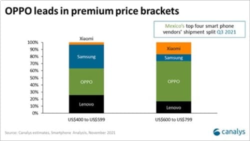 หลังจากเวลาเพียง 2 ปี นับตั้งแต่การเข้าสู่ตลาดละตินอเมริกาครั้งแรก OPPO ยังคงขยายตัวได้อย่างรวดเร็ว โดยในเม็กซิโก OPPO ครองตำแหน่ง 5 อันดับสูงสุดของแบรนด์สมาร์ทโฟนที่มียอดขายดีที่สุดในประเทศด้วยส่วนแบ่งทางการตลาด 10% และมีอัตราการเติบโตต่อปี 429% ในปี 2564 นอกจากนี้ OPPO ยังได้เสริมสร้างความร่วมมือกับผู้ให้บริการท้องถิ่นแลมีการเปิดตัว Reno series ที่เป็นที่ชื่นชอบ โดย OPPO กลายเป็นผู้จำหน่ายสมาร์ทโฟนชั้นนำในเม็กซิโกในช่วงราคา 400 ถึง 599 ดอลลาร์สหรัฐฯ และ 600 ดอลลาร์สหรัฐฯ ถึง 799 ดอลลาร์สหรัฐฯ
