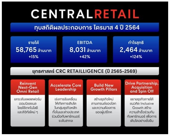 เซ็นทรัล รีเทล ประกาศความสำเร็จ ผลประกอบการ ไตรมาส 4/2564 ทุบสถิติสูงสุด พลิกทั้งปีกลับมามีกำไรและจ่ายเงินปันผล 0.30 บาทต่อหุ้น