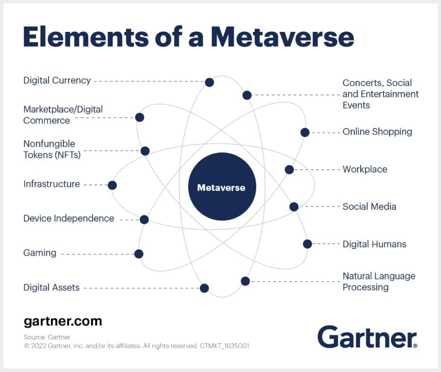 การ์ทเนอร์ให้นิยามของ Metaverse ว่าเป็นพื้นที่เสมือนจริงที่เปิดโอกาสให้กลุ่มคนที่มีความสนใจในเรื่องเดียวกันมาแบ่งปันใช้ร่วมกัน โดยสร้างขึ้นจากการผสมผสานความเป็นจริงทางกายภาพและดิจิทัลเข้าไว้ด้วยกันเพื่อมอบประสบการณ์ที่สมจริงยิ่งขึ้น ตลอดจนสามารถเข้าถึงผ่านอุปกรณ์ชิ้นเดียวหรืออุปกรณ์ชนิดอื่น ๆ ตั้งแต่แท็บเล็ตจนถึงจอแสดงผลแบบสวมศีรษะ