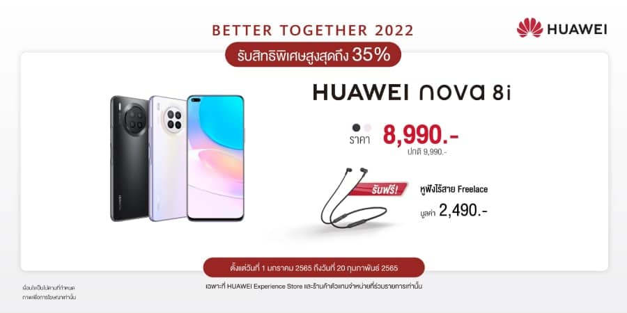 หัวเว่ยมอบข้อเสนอสุดคุ้มที่ห้ามพลาดด้วยประการทั้งปวงกับแคมเปญ BETTER TOGETHER 2022 ครอบคลุมสมาร์ทดีไวซ์หลากหลายกลุ่มผลิตภัณฑ์ อาทิ แท็บเล็ต แล็ปท็อป สมาร์ทโฟน และสมาร์ทวอทช์ จัดเต็มส่วนลดสูงสุดถึง 35% พร้อมของสมนาคุณมากมาย ตั้งแต่ 1 มกราคม 2565 ถึง 20 กุมภาพันธ์ 2565 เมื่อซื้อสินค้าที่ HUAWEI Experience Store และ ร้านค้าตัวแทนจำหน่ายที่ร่วมรายการเท่านั้น
