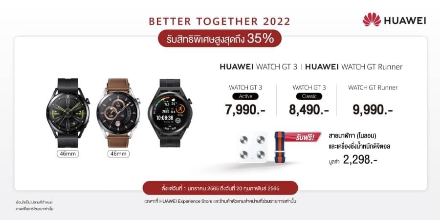 HUAWEI WATCH GT 3 Series สมาร์ทวอทช์ที่เป็นเสมือนเพื่อนคู่ใจตัวจริงของคนรักสุขภาพ มาพร้อมความสามารถในการตรวจวัดค่าทางสุขภาพ และฟีเจอร์จัดสรรการออกกำลังกายอัจฉริยะ อายุการใช้งานแบตเตอรี่ยาวนานถึง 14 วัน รับฟรีทันทีสายนาฬิกาไนลอน และเครื่องชั่งน้ำหนักดิจิตอล HUAWEI Scale 3 รวมมูลค่าทั้งหมด 2,298 บาท เมื่อซื้อสมาร์ทวอทช์ 3 รุ่น ได้แก่
