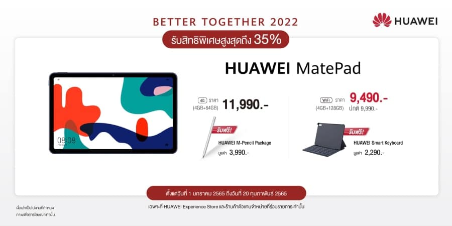 - HUAWEI MatePad (4G) 4GB+64GB ราคา 11,990 บาท ฟรี! HUAWEI M-Pencil มูลค่า 3,990 บาท