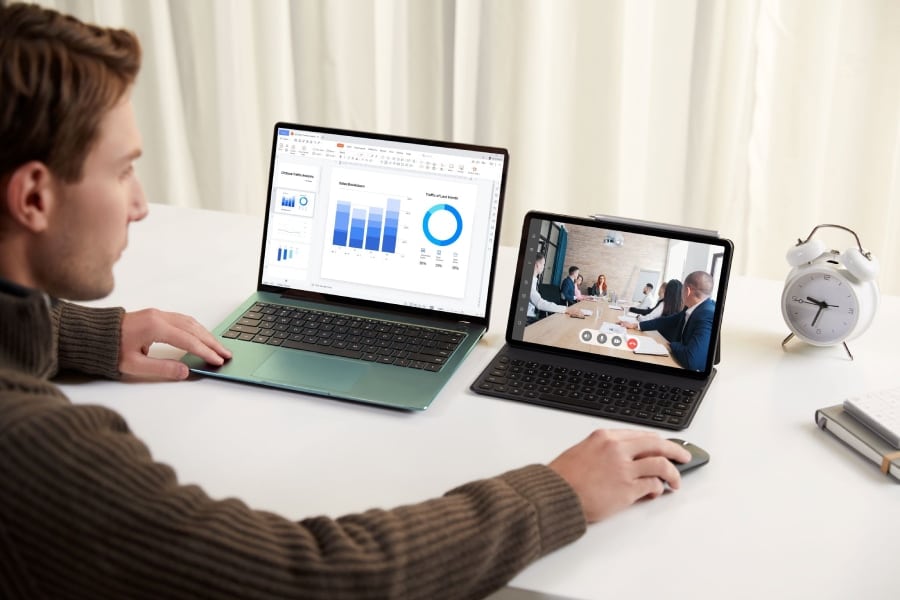 ด้วยเทคโนโลยีและการเชื่อมต่อไร้ขอบเขตซึ่งช่วยให้เราปิดจ๊อบจากที่ไหนก็ได้ทำให้การทำงานแบบไฮบริดที่ไม่จำเป็นต้องเข้าออฟฟิศทุกวันคือคำตอบของคนยุคนี้ แต่สิ่งที่ขาดไม่ได้สำหรับใครที่ต้องการเพิ่มประสิทธิภาพการทำงานคืออุปกรณ์ดีๆ ที่เติมเต็มศักยภาพได้ถึงขีดสุด อย่าง MateBook D 15 แล็ปท็อปบางเบาเหมาะแก่การพกพา มาพร้อมหน้าจอ HUAWEI FullView Display ที่มีการใช้พื้นที่หน้าจอมากถึง 87% ซึ่งจะช่วยเพิ่มความโปรดักทีฟขึ้นอีกหลายเท่าเมื่อจับคู่กับแท็ปเล็ตทรงพลังหน้าจอแสดงผลคมชัดระดับ 2K อย่าง HUAWEI MatePad ผ่านฟีเจอร์ Multi-Screen Collaboration ตอบโจทย์การทำงานแบบ Multitasking และ Multifunction ได้สบายๆ ด้วยฟังก์ชัน HUAWEI Share ซึ่งมีด้วยกันถึง 3 โหมด คือ Extend Mode เปลี่ยนแท็บเล็ตเป็นหน้าจอเสริมเอาใจคนทำงานไวจะได้ไม่ต้องสลับหน้าต่างไปมา Mirror Mode เชื่อมหน้าจอแท็บเล็ตกับหน้าจอแล็ปท็อปให้แสดงผลเหมือนกันแบบเรียลไทม์ และ Collaborate Mode รับ-ส่งไฟล์สารพัดรูปแบบข้ามดีไวซ์ได้ในอึดใจเดียว