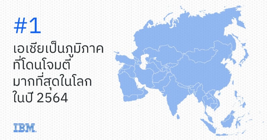 - เอเชียเป้าโจมตีสูงสุด จากการสังเกตของไอบีเอ็ม เอเชียประสบกับการโจมตีมากกว่า 1ใน 4 ของเหตุที่เกิดขึ้นทั่วโลกในปี 2564 ซึ่งมากกว่าภูมิภาคอื่น โดยธุรกิจบริการทางการเงินและการผลิต ประสบกับเหตุโจมตีนับเป็นเกือบ 60% ของเหตุที่เกิดขึ้นทั้งหมดในเอเชีย