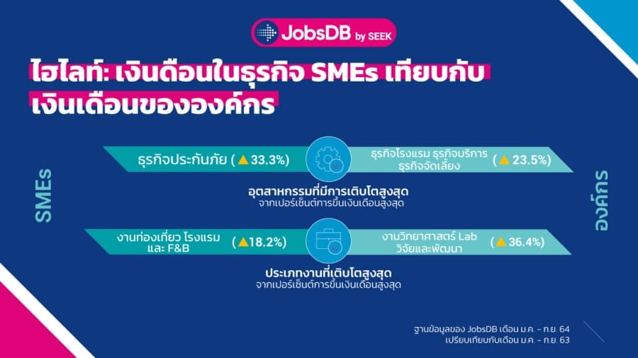 ผลสำรวจในปีนี้ยังได้วิเคราะห์ถึงนัยยะสำคัญอีกประเด็นหนึ่งว่า ขนาดขององค์กรอาจไม่ใช่สิ่งสำคัญที่จะชี้วัดอัตราเงินเดือนอีกต่อไป โดยทั่วไปแล้ว องค์กรขนาดใหญ่มักจะเสนอเงินเดือนที่สูงกว่า แต่ปัจจุบัน บางสายงานที่เป็นที่ต้องการ หรือต้องการความรู้ ความเชี่ยวชาญ ก็มีความเป็นไปได้ที่ธุรกิจ SMEs จะเสนอเงินเดือนที่มากกว่าเพื่อให้เกิดการจ้างงาน โดยจากข้อมูลเชิงลึกของเงินเดือนในธุรกิจ SMEs เมื่อเทียบกับองค์กรขนาดใหญ่ พบว่า อุตสาหกรรม SMEs ที่มีการเติบโตมากที่สุดคือ อุตสาหกรรมประกันภัย (Insurance) ซึ่งมีเปอร์เซ็นต์การขึ้นเงินเดือนสูงสุดอยู่ที่ 33.3% และประเภทงานที่มีการเติบโตมากที่สุดคือ งานท่องเที่ยว โรงแรม และ F&B (Hotel/Restaurant) ซึ่งมีเปอร์เซ็นต์การขึ้นเงินเดือนสูงสุดที่ 18.2%
