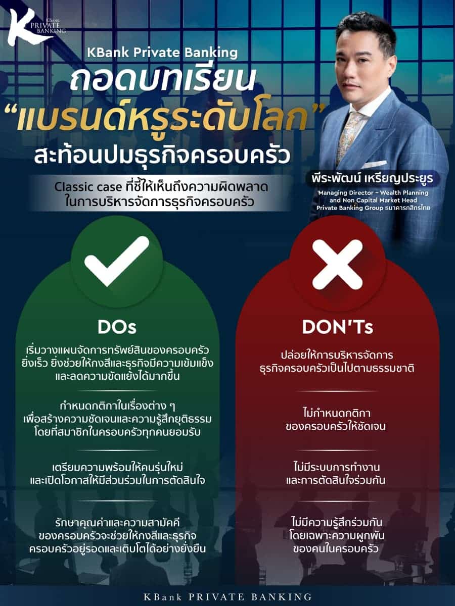 “สุดท้ายนี้ หากใครมีโอกาสได้ดูภาพยนตร์เรื่องนี้แล้ว อย่าลืมย้อนกลับมาดูธุรกิจครอบครัวของตนเองด้วยว่ามีอะไรที่เราได้ทำพลาดเหมือนตระกูลดังกล่าวหรือไม่ KBank Private Banking ในฐานะผู้ให้บริการไพรเวทแบงก์ที่มีความเชี่ยวชาญด้าน ‘บริการที่ปรึกษาด้านการบริหารทรัพย์สินครอบครัว’ (Family Wealth Planning Service) มุ่งมั่นพัฒนาคุณภาพบริการอย่างต่อเนื่อง เพื่อช่วยให้ทุกๆ ครอบครัวสามารถวางแผนและดำเนินการบริหารธุรกิจครอบครัวได้อย่างมีประสิทธิภาพและเป็นกำลังขับเคลื่อนที่สำคัญของระบบเศรษฐกิจไทยต่อไป” นายพีระพัฒน์ กล่าวปิดท้าย