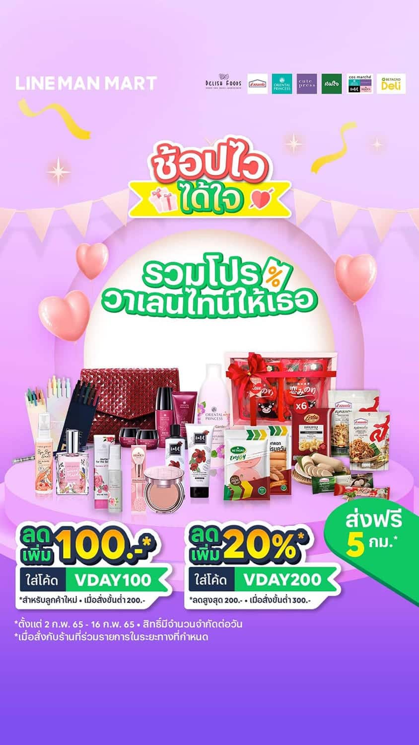 หวานมากขึ้นกับโปร “ช้อปไวได้ใจ รวมโปรวาเลนไทน์ให้เธอ” ช้อปแบรนด์ดัง อาทิ Betagro Deli, Oriental Princess, cos marché , Cute Press, Delish Foods ยกขบวนลดสูงสุดถึง 50% พร้อมรอรับเซอร์ไพร์สคูปองเมื่อช้อปสินค้าภายในวันที่ 12-14 กุมภาพันธ์ 2565