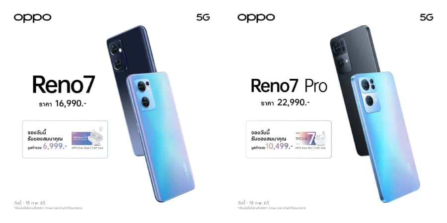 OPPO Reno7 Series 5G สมาร์ทโฟน 5G ที่ถ่ายวิดีโอพอร์ตเทรตได้ดีที่สุด ตอกย้ำความเป็น The Portrait Expert ตัวจริง วางจำหน่าย 2 รุ่น ได้แก่ OPPO Reno7 5G ราคา 16,990 บาท มีให้เลือก 2 สี ได้แก่ สีฟ้า Startrails Blue และสีดำ Starry Black ส่วน OPPO Reno7 Pro 5G ราคา 22,990 บาท มี ให้เลือก 2 สี ได้แก่ สีฟ้า Startrails Blue และสีดำ Starlight Black ผู้ที่สนใจสามารถได้แล้วตั้งแต่วันนี้ถึง 18 กุมภาพันธ์ พร้อมรับโปรโมชั่นและเซ็ตของพรีเมี่ยม สำหรับผู้ที่จอง OPPO Reno7 5G รับฟรี OPPO Enco Buds และ E-VIP Card ประกันหน้าจอแตก มูลค่ารวม 6,999 บาท และสำหรับผู้ที่จอง OPPO Reno7 Pro 5G รับฟรี OPPO Enco Air2 รุ่นใหม่ล่าสุดที่จะเปิดตัวเร็วๆ นี้ และ E-VIP Card ประกันหน้าจอแตก มูลค่ารวม 10,499 บาท และพิเศษเมื่อจองผ่านผู้ให้บริการเครือข่าย ราคาเริ่มต้นเพียง 6,990 บาท สามารถไปทดลองสัมผัสหรือเป็นเจ้าของได้แล้ววันนี้ ณ OPPO Brand Shop ทุกสาขา และตัวแทนจำหน่ายทั่วประเทศ