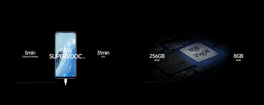 สำหรับ OPPO Reno7 5G รองรับการสื่อสารแห่งอนาคต 5G และ Wi-Fi 6 เพื่อมอบการเชื่อมต่อที่รวดเร็วมากยิ่งขึ้นด้วยขุมพลัง MediaTek Dimensity 900 5G SoC พร้อมกับ RAM ขนาดใหญ่ 8GB และ ROM 256GB อีกทั้งยังมาพร้อมเทคโนโลยี RAM Expansion เพิ่ม RAM ได้สูงสุด 5GB มอบประสิทธิภาพการใช้งานได้อย่างลื่นไหลไม่มีสะดุด ถึงแม้จะมีดีไซน์บางเฉียบ แต่ยังมาพร้อมแบตเตอรี่ขนาดใหญ่ถึง 4,500mAh ควบคู่กับ 65W SUPERVOOCTM ชาร์จไวขั้นสุดเพียง 31 นาที สามารถชาร์จได้เต็ม 100% และชาร์จเพียง 5 นาที สามารถเล่นเกมได้นานถึง 2 ชั่วโมง