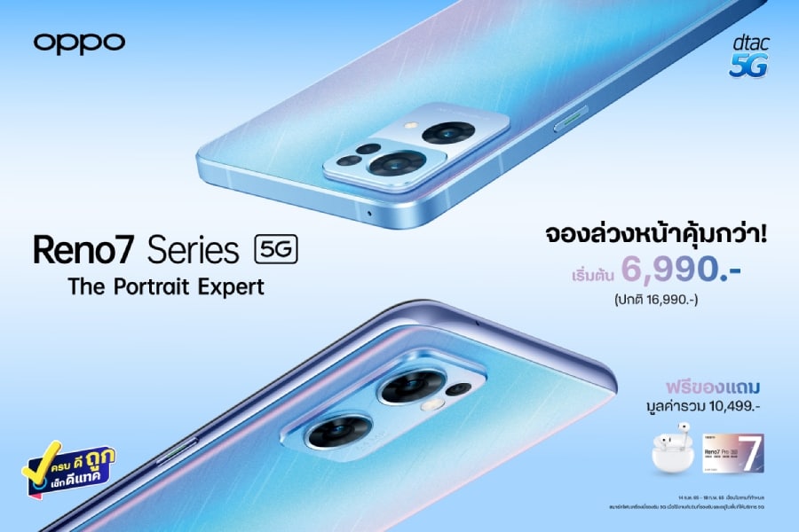 พร้อมให้คุณเป็นเจ้าของ OPPO Reno7 Series 5G ในราคาสุดคุ้มเริ่มต้นเพียง 6,990 บาท พร้อมข้อเสนอสุดเอ็กซ์คลูซีฟจากดีแทคมากมายที่ศูนย์บริการดีแทคทั่วประเทศ หรือ dtac online store ตั้งแต่วันนี้ – 18 กุมภาพันธ์ 2565