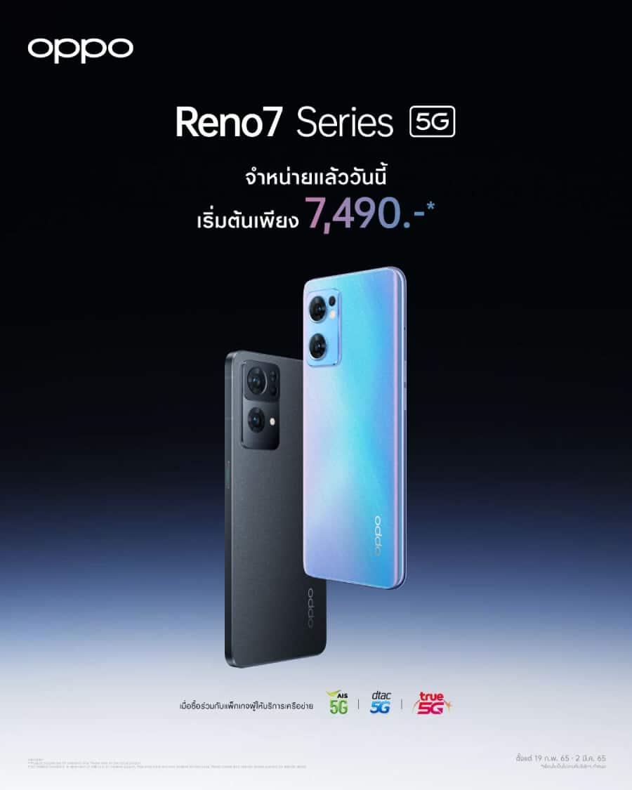 เป็นเจ้าของ OPPO Reno7 Series 5G ได้แล้ววันนี้ทั้ง 2 รุ่น ได้แก่ OPPO Reno7 5G ในราคา 16,990 บาท และ OPPO Reno7 Pro 5G ในราคา 22,990 บาท พร้อมรับฟรีของสมนาคุณ มูลค่ารวมสูงสุด 4,698 บาท เมื่อซื้อ OPPO Reno7 Pro 5G รับฟรี OPPO Sports bag มูลค่า 2,499 บาท และ OPPO Bluetooth Speaker มูลค่า 2,199 บาท และเมื่อซื้อ OPPO Reno7 5G รับฟรี OPPO Sports Bag มูลค่า 2,499 บาท สามารถเป็นเจ้าของได้แล้ววันนี้ ณ OPPO Brand Shop และตัวแทนจำหน่ายทั่วประเทศ หรือสามารถเป็นเจ้าของได้ง่ายมากขึ้นเมื่อซื้อ OPPO Reno7 5G และ Reno7 Pro 5G ผ่านผู้ให้บริการเครือข่าย ในราคาเริ่มต้นเพียง 7,490 บาท ตั้งแต่วันนี้ ถึงวันที่ 2 มีนาคม 2565 โดยเงื่อนไขเป็นไปตามที่บริษัทฯ กำหนด