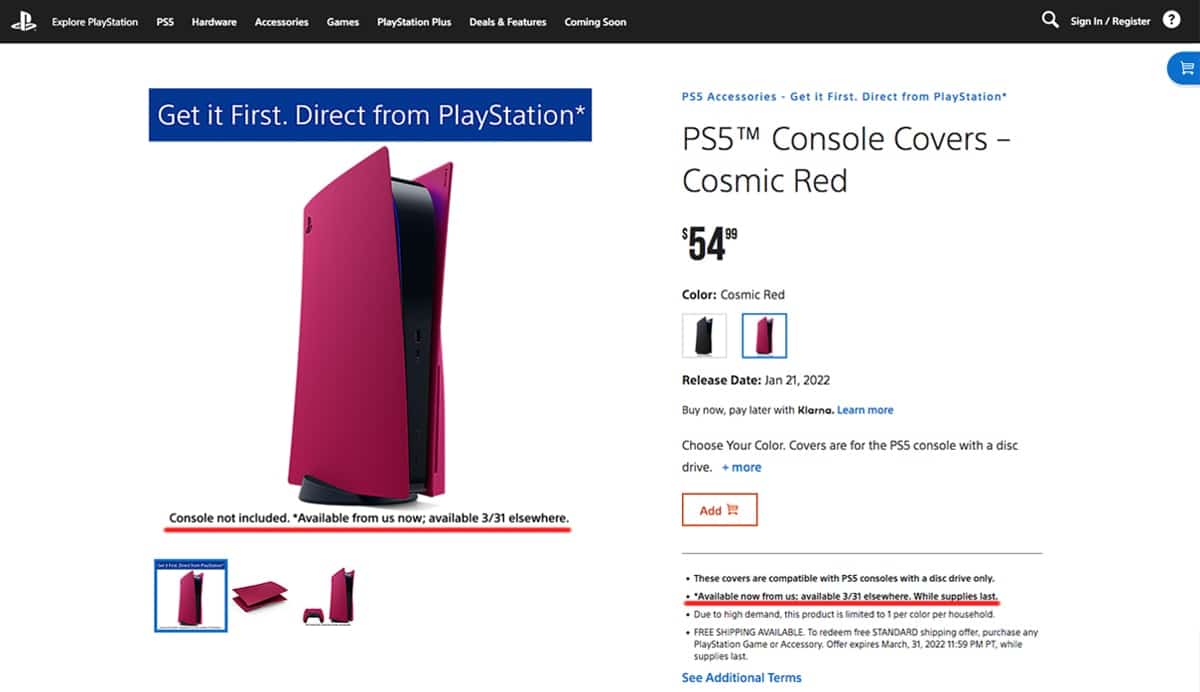 อย่างไรก็ตาม ทาง Sony เคยประกาศไปว่าจะเริ่มขาย Console Cover 2 สีแรกอย่าง Midnight Black และ Cosmic Red ในสโตร์ค้าปลีกต่างๆ ตั้งแต่วันนี้เป็นต้นไป แต่ดูเหมือนจะไม่เป็นเช่นนั้นแล้ว โดยที่ทั้ง PlayStation Direct ในสหรัฐอเมริกาและสหราชอาณาจักรมีการอัปเดตข้อมูลผลิตภัณฑ์ให้กับลูกค้าว่าสโตร์ค้าปลีกรายอื่นๆ จะไม่มีการวางขายจนถึงเดือนมีนาคม