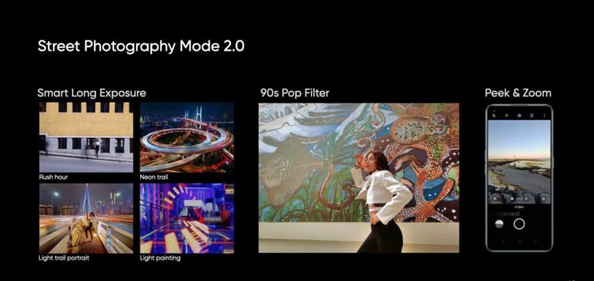 นอกจากนี้ realme ยังได้เชิญแฟน ๆ ร่วมกันสร้างสรรค์ฟิลเตอร์ ที่เรียกว่า ฟิลเตอร์ ยุค 90 เหมาะอย่างยิ่งสำหรับการถ่ายภาพแนวสตรีทและสแน็ปช็อตในชีวิตประจำวัน ไม่เพียงเท่านี้ realme ยังมีฟีเจอร์ใหม่สำหรับมือโปรกับ Peak และ Zoom ที่คุณสามารถซูมและโฟกัสได้อย่างแม่นยำด้วยปุ่มเดียว ช่วยให้ทุกคนสามารถจับภาพช่วงเวลาสำคัญได้โดยตรงจากสมาร์ตโฟน โดยไม่ต้องเป็นผู้เชี่ยวชาญด้านการถ่ายภาพอีกต่อไป