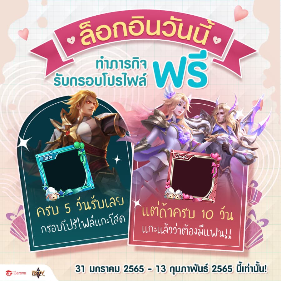 ล็อกอินรับกรอบโปรไฟล์วาเลนไทน์ เมื่อล็อกอินสะสมครบ 5 วัน รับกรอบโปรไฟล์คนโสด และเมื่อล็อกอินสะสมครบ 10 วัน รับกรอบโปรไฟล์คนมีแฟน ไว้ตั้งโชว์สถานะกันในช่วงเทศกาลวันวาเลนไทน์นี้ ระหว่างวันที่ 31 ม.ค. 2565 – 13 ก.พ. 2565 นี้เท่านั้น