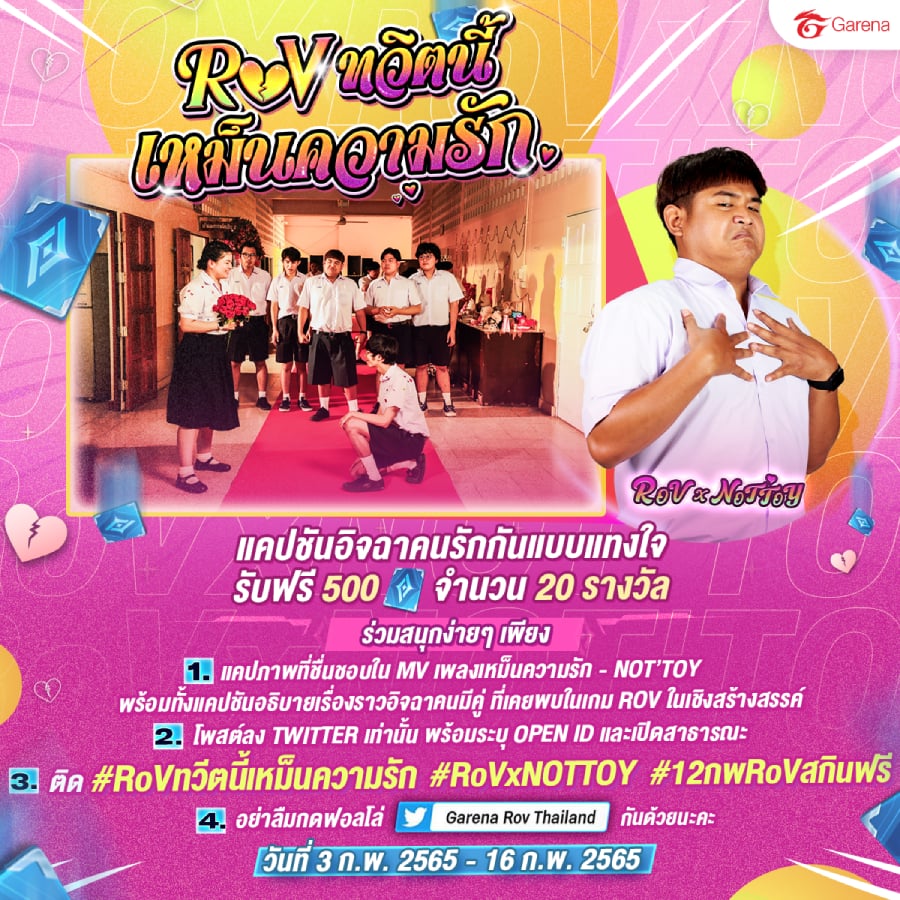 สำหรับชาวทวิตเตอร์ เพียงแคปภาพที่ชื่นชอบใน MV เพลง “เหม็นความรัก” – NOT’TOY และทวีตลง Twitter ของคุณ พร้อมอธิบายเรื่องราวอิจฉาคนมีคู่ในเกม RoV และติด #RoVทวีตนี้เหม็นความรัก #RoVxNOTTOY #12กพRoVสกินฟรี ใครเขียนแคปชันได้แทงใจทีมงานที่สุด รับไปเลย 500 คูปอง จำนวน 20 รางวัล ระยะเวลากิจกรรม 3 ก.พ. 2565 – 16 ก.พ. 2565 สามารถอ่านกติกาฉบับเต็มได้ที่นี่ https://bit.ly/3ro0CTX