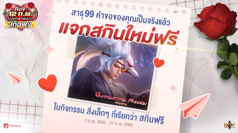 12 ก.พ. 2565 นี้ อย่าลืมเข้าเกม RoV มาฉลองเทศกาลวาเลนไทน์ และรับสกิน Summertime Hanabi Hayate ฟรีไปด้วยกัน จะคนโสดหรือมีคู่ก็ห้ามพลาด!