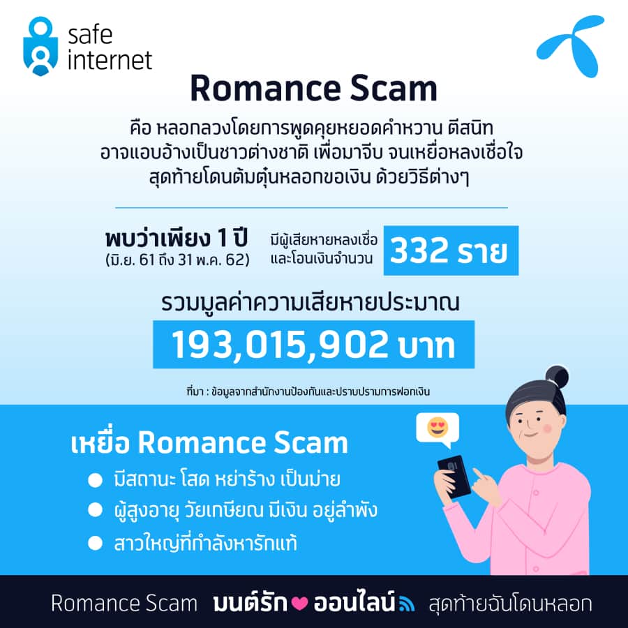 dtac Safe Internet ชวนทำความรู้จักภัยกลโกงไซเบอร์ที่อาจแฝงมาใน วันวาเลนไทน์ Romance Scam หรือการ ‘หลอกให้รัก หวังแสวงหาผลประโยชน์จากความเชื่อใจของเหยื่อ’ โดยหลอกให้โอนเงินหรือทรัพย์สินไปให้ ปัจจุบันมีผู้เสียหายจากการหลอกโอนเงินมากมาย และหนึ่งในกลโกงออนไลน์ที่มี มีผู้เสียหายตกเป็นเหยื่อมากที่สุดคือ Romance Scam สำหรับประเทศไทยนั้น ข้อมูลจากสำนักงานป้องกันและปราบปรามการฟอกเงิน ได้ระบุว่า ในช่วงหนึ่งปีที่ผ่านมานับตั้งแต่เดือนมิถุนายน พ.ศ. 2561 จนถึง 31 พฤษภาคม พ.ศ. 2562 สถิติการรับเรื่องคดีที่เป็น Romance Scam มีผู้เสียหายหลงเชื่อและโอนเงินจำนวน 332 ราย รวมมูลค่าความเสียหายประมาณ 193,015,902.11 บาท