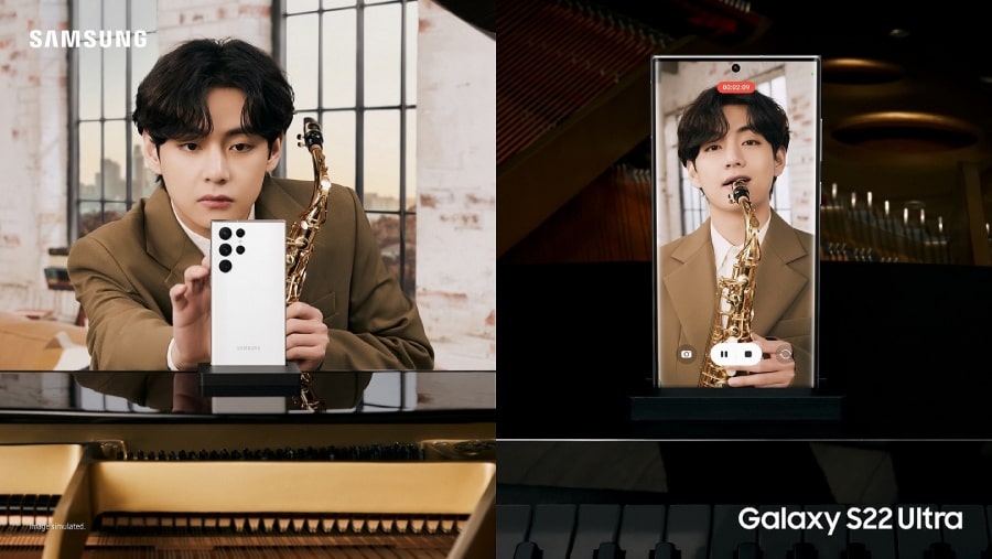 ลุคนี้ของ V หรือคิมแทฮยอง รับรองได้เลยว่าทำเอาสาวๆ ใจละลายแน่นอน ซึ่งภาพนี้เล่าเรื่องราวแพสชั่นในดนตรีแจ๊สและการเป่าแซกโซโฟนของแทแท ซึ่งด้วย Galaxy S22 Ultra สีขาว Phantom White กับกล้องหน้าความละเอียด