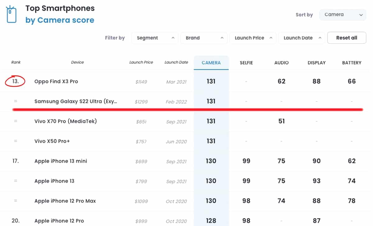 เมื่อเทียบกับคู่แข่งอย่าง iPhone 13 Pro Max ที่ได้คะแนนรวม 137 คะแนน แต่พบว่า Galaxy S22 Ultra มีบางจุดที่ทำได้ดีกว่า เช่น เรื่องการซูม เป็นต้น