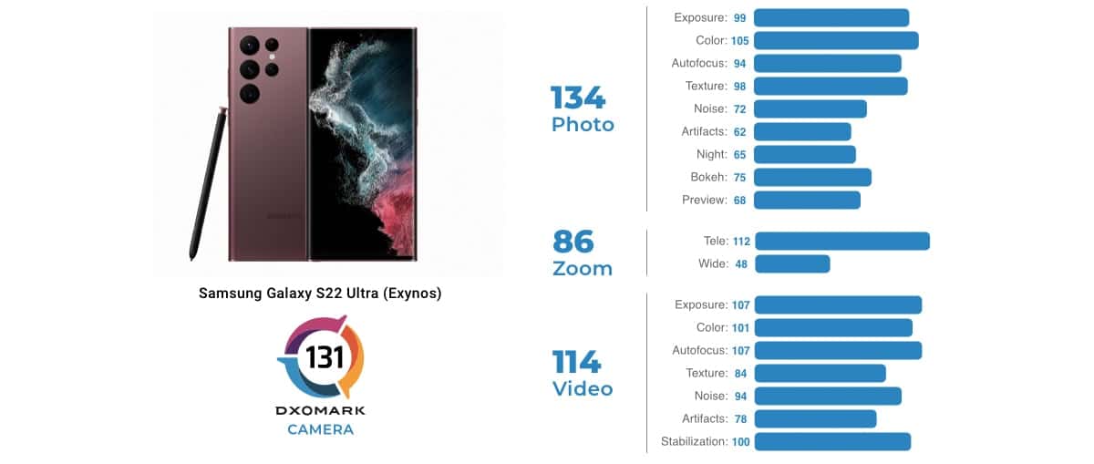 โดยคะแนนรวม 131 คะแนนของ Galaxy S22 Ultra (ตัวชิป Exynos) นั้นแบ่งเป็นหมวดการทดสอบต่างๆ ดังนี้