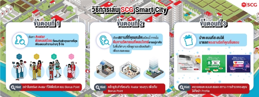 เอสซีจี ชวนทุกคนออกเดินทางสำรวจเมืองจำลองในรูปแบบ Gamification พร้อมเรียนรู้นวัตกรรมสินค้า และโซลูชันจาก SCG ที่จะช่วยตอบโจทย์ความต้องการของไลฟ์สไตล์ในปัจจุบัน ภายใต้พื้นที่ใช้สอยที่แตกต่างหลากหลาย และนำมาต่อยอดเป็นแรงบันดาลใจในการสร้างบ้านในฝัน อีกทั้งยังสามารถสะสมแต้ม เพื่อแลกสิทธิประโยชน์ และรางวัลต่างๆ ตั้งแต่วันนี้ คลิก