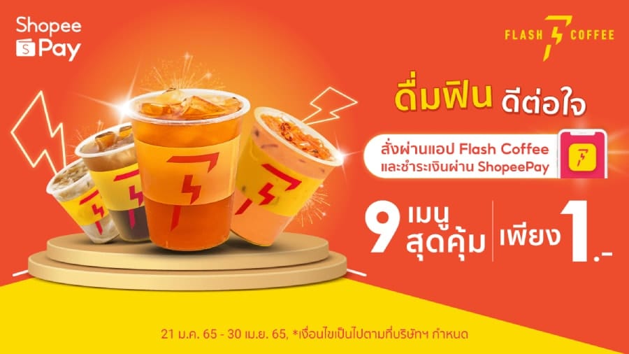 เตรียมพบกับเครื่องดื่มราคาสุดคุ้ม 1 บาท เพียงสั่งเครื่องดื่มทั้ง 9 เมนู ผ่านแอปพลิเคชัน Flash Coffee ไม่ว่าจะเป็น Americano, Black Ice Tea, Ice Tea, Thai Tea 9 Doi Dung, Milk Tea, Icepresso, Latte, Cappuccino และ Cocoa ในขนาด 12 oz. และเลือกชำระเงินผ่านทาง ShopeePay เท่านั้น