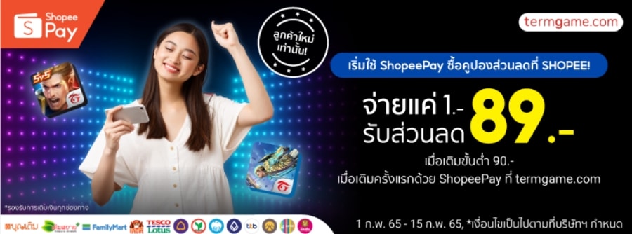 - ผู้ใช้งานใหม่เฮลั่น เพียง 1 บาทก็เติมเกมได้ เมื่อเติมเกมครั้งแรกบนเว็บไซต์ termgame.com แล้วชำระผ่าน ShopeePay รับส่วนลดทันที 149 บาท เมื่อชำระขั้นต่ำ 150 บาท