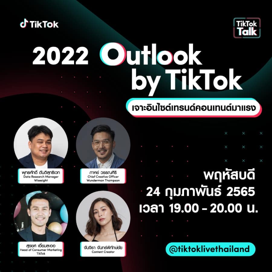 พบกับ TikTok Talk ครั้งแรกของปี กับประเด็นสุดฮอตที่ไม่ฟังไม่ได้แล้ว 2022 Outlook by TikTok เจาะอินไซต์ เทรนด์คอนเทนต์มาแรง 24 กุมภาพันธ์นี้ เวลา 19.00 น. – 20.00 น. @tiktoklivethailand เท่านั้น